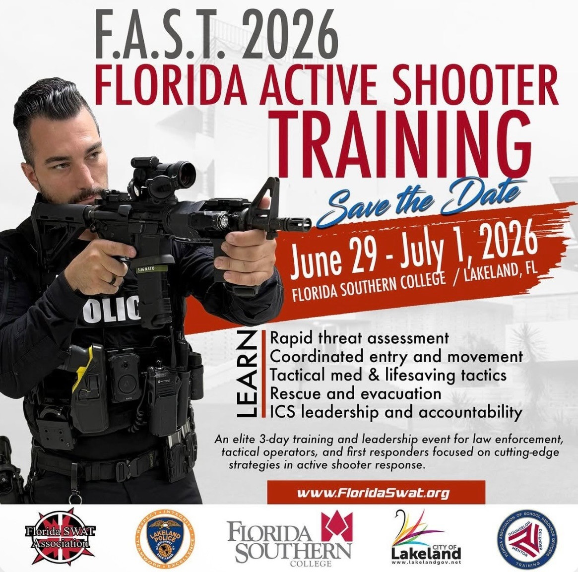 The Florida Swat Association, Florida Southern College, and City of Lakeland are thrilled to announce the first annual F.A.S.T Conference 2026 (Florida Active Shooter Training)